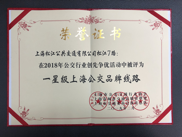 松江7路荣获2018年一星级上海公交品牌线路