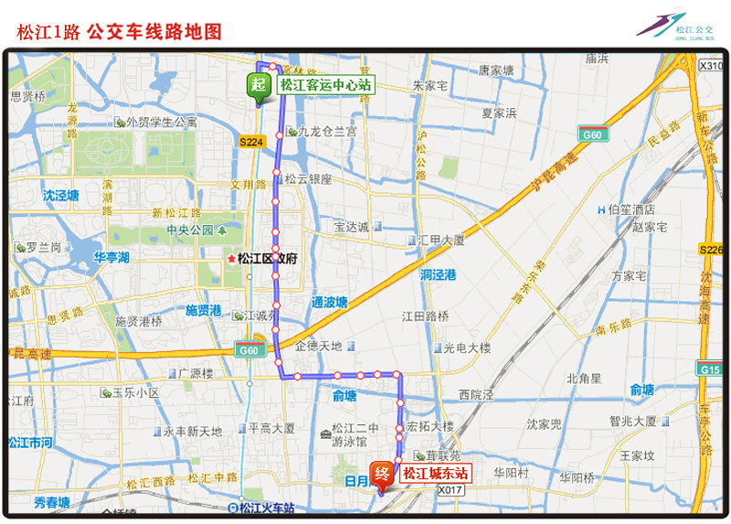 | 线路走向:由松江客运中心起经广富林路、谷阳北路、荣乐路、松东路、环城路至松江城东站。 |
