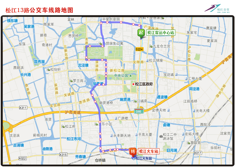 | 线路走向:由松江客运中心起经嘉松公路、广富林路、龙腾路、文汇路、龙源路、文翔路、江学路、文诚路、玉树北路、玉树南路、松汇路、人民南路至松江火车站。 |