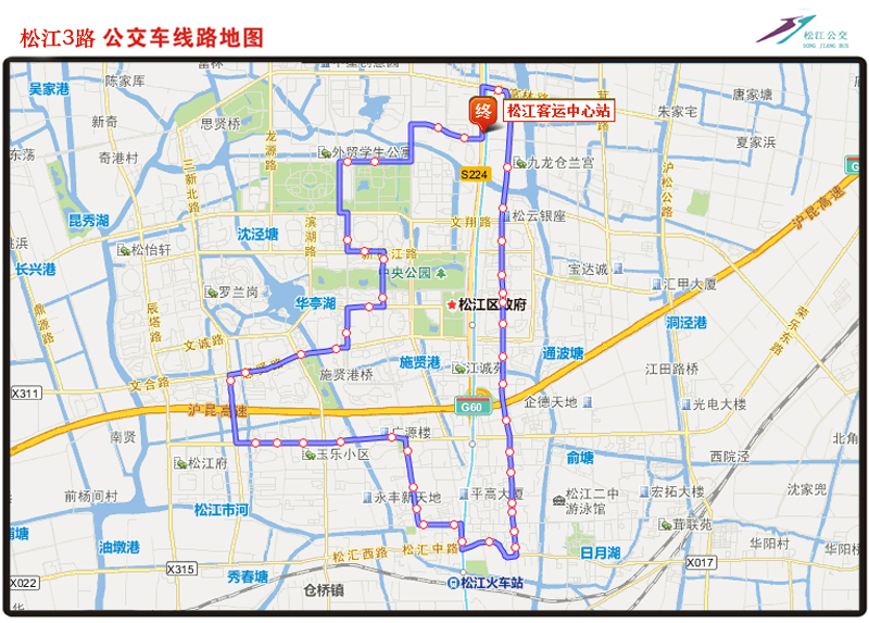 | 线路走向:(上行)由松江客运中心起经嘉松公路、梅家浜路、人民北路、文汇路、龙腾路、江学路、新松江路、西林北路、文诚路、江学路、思贤路、三新路、荣乐路、西林北路、中山中路、人民路、松汇路、谷阳路、梅家浜路至松江客运中心。(下行)由松江客运中心起经嘉松公路、广富林路、谷阳路、松汇路、人民路、中山中路、西林北路、荣乐路、三新路、思贤路、江学路、文诚路、西林北路、新松江路、江学路、龙腾路、文汇路、人民北路、梅家浜路至松江客运中心 |