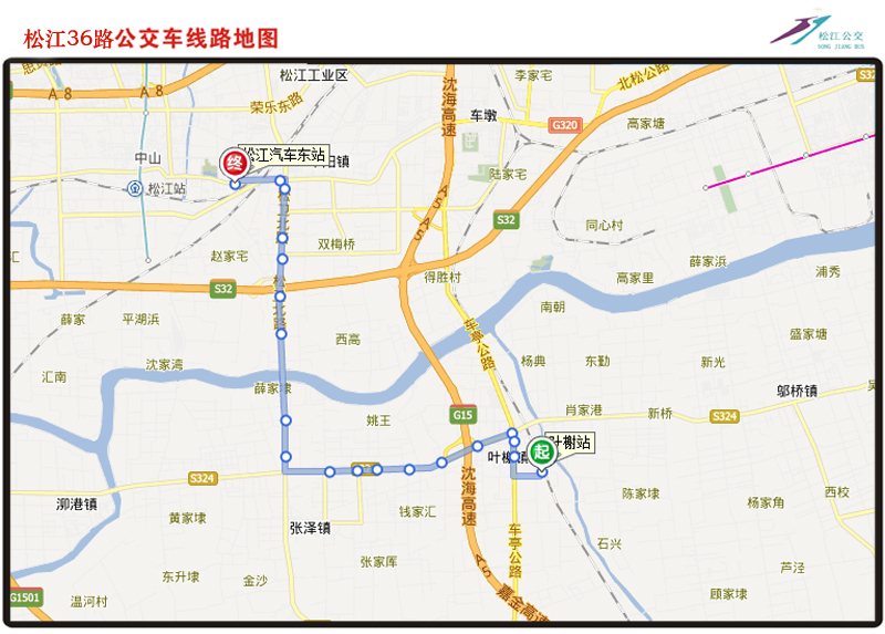 | 线路走向:自松江汽车东站起经松汇东路、北松公路、松卫公路、镇北路、张泽路、叶新公路、车亭公路、叶权路至叶榭站 |