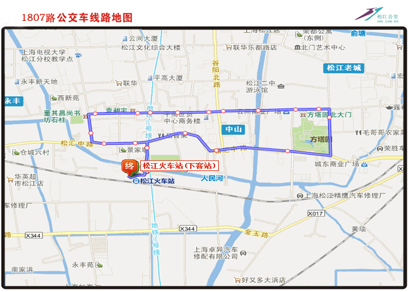 | 线路走向:自松江火车站起经人民南路、松汇路、方塔路、中山路、西林路、松汇路、人民南路至松江火车站 |