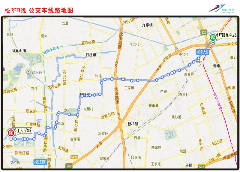 | 线路走向:自外环路地铁站起经沪闵路、莘松公路、莘砖公路、泗砖路、洞泾长兴路、沪松公路、辰花公路、光星路、广富林路、嘉松公路、梅家浜路、松江人民北路、文汇路至松江大学城。 |