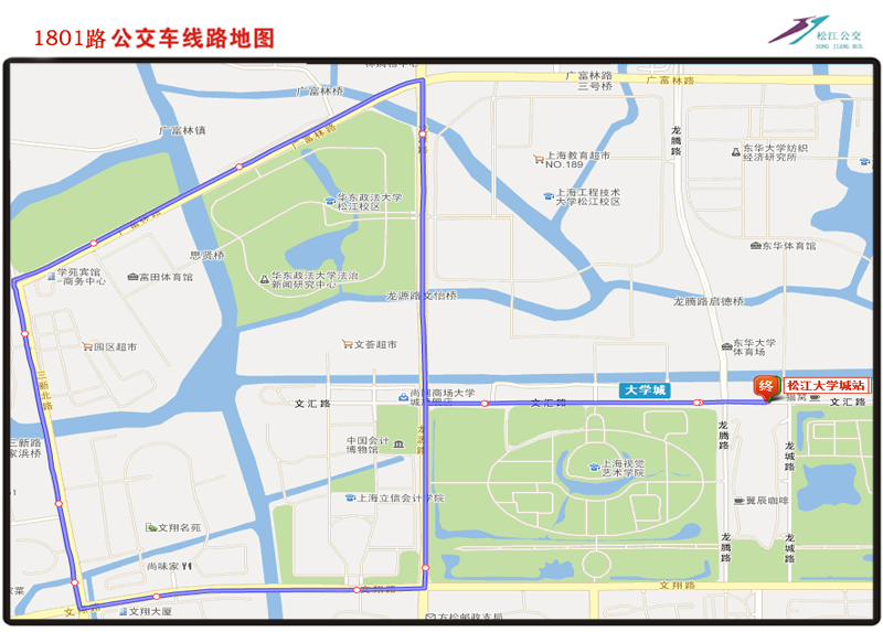 | 线路走向:(上行)自松江大学城起经龙腾路、文汇路、龙源路、广富林路至广富林路三新路。(下行)自广富林路三新路起循原线至龙胜路、松江大学城。 |