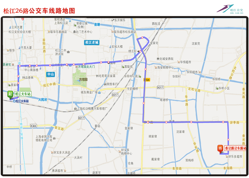 | 线路走向:由松江火车站起经人民南路、中山路、松卫北路、泖亭路、香泾路至香泾路泾车路。 |