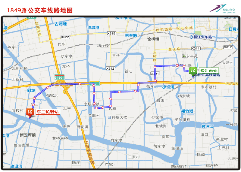 | 线路走向:(上行)自东三轮渡站起经东三公路、塔闵路、塔汇路、育新路、贵南路、长塔路、长石路、塔闵路、玉树路、玉阳路、富民路、盐仓路至松江南站。(下行)自松江南站起经盐仓路、中桥路、富民路、玉阳路、玉树路、塔闵路、长石路、长塔路、贵南路、育新路、塔汇路、塔闵路、东三公路至东三轮渡。 |