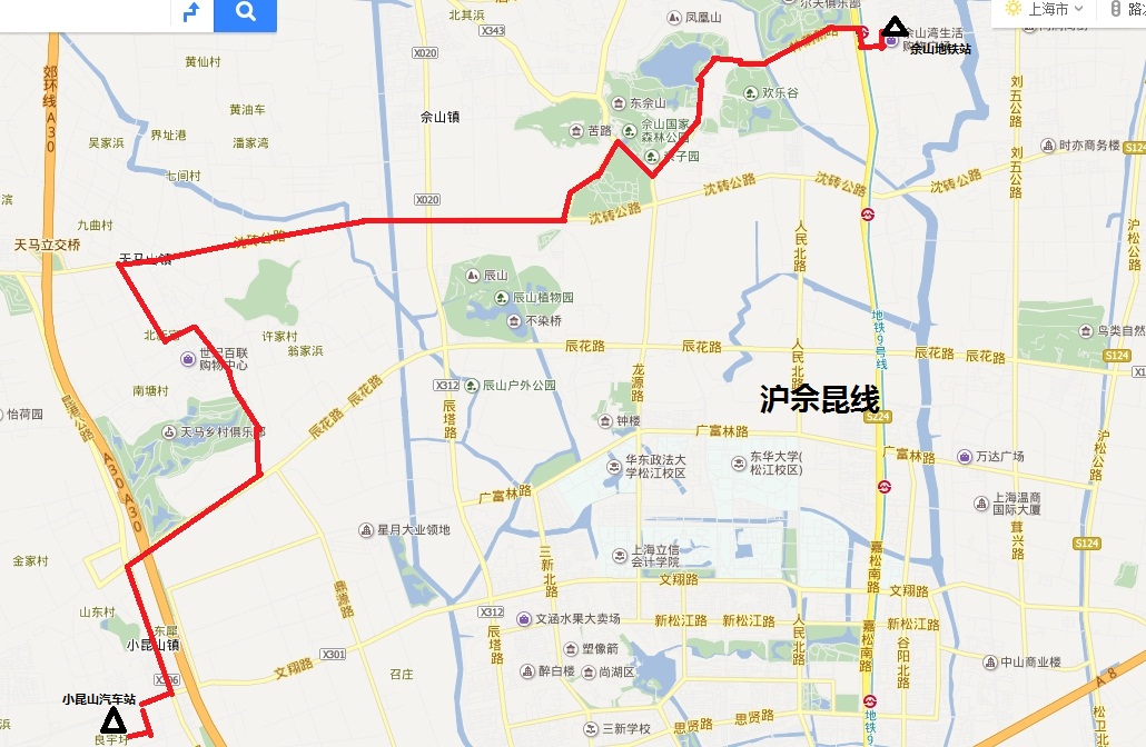 | 线路走向:自佘山地铁站起经古楼路、嘉松公路、林荫新路、外青松公路、佘天昆公路、沈砖公路、新宅路、天新路、佘天昆公路、昆港公路、文翔路至小昆山汽车站。 |