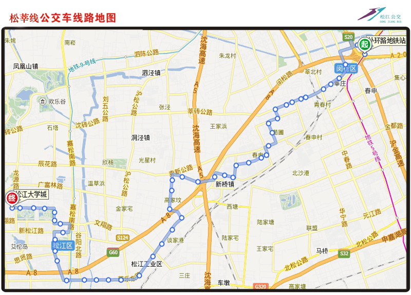 | 线路走向:自外环路地铁站起经报春路、水清路、沪闵路、莘松路、场西路、新南路、明兴路、明中路、明华路、陈春路、新育路、新北街、九新公路、卖新公路、庙三路、荣乐路、人民北路、新松江路、嘉松公路、文翔路、人民北路、文汇路至大学城。自松江大学城起,循原线至沪闵路至外环路地铁站。 |