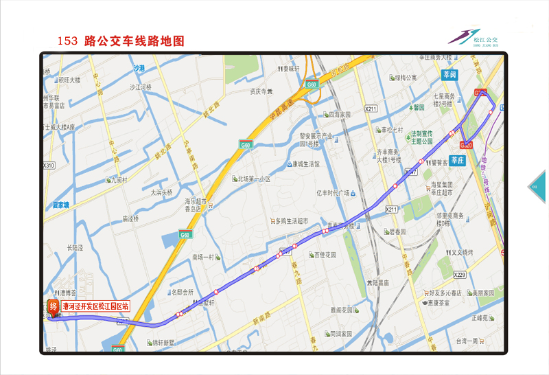| 线路走向:(上行)自漕河泾开发区松江园区起经莘松路、沪闵公路、水清南路、莘建东路至莘庄地铁北广场。(下行)自莘庄地铁北广场起经莘建东路、沪闵路、莘松路至漕河泾开发区松江园区。 |