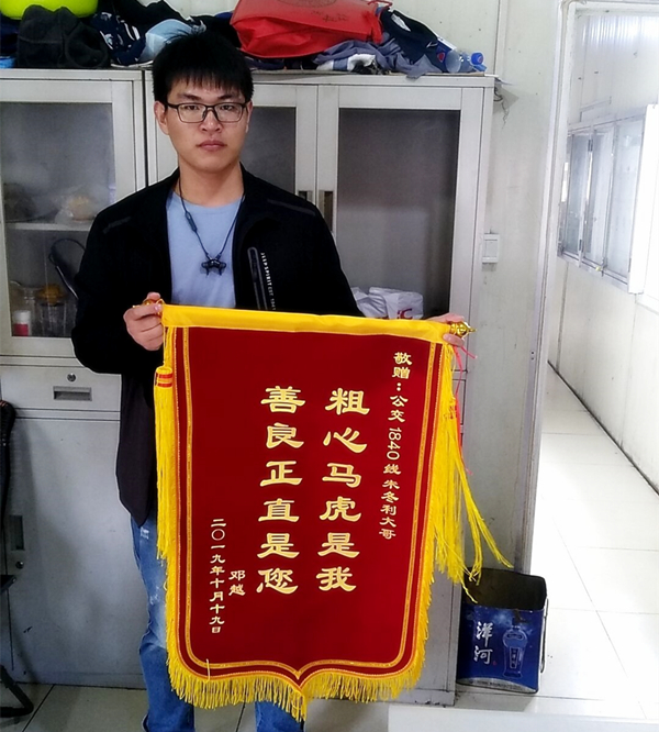 为了当面表示感谢之情,几天后邓先生带着锦旗来到了九亭站调度室,感谢驾驶员朱冬利的热心举动,这种拾金不昧的崇高精神令人暖心,是值得传扬的正能量。