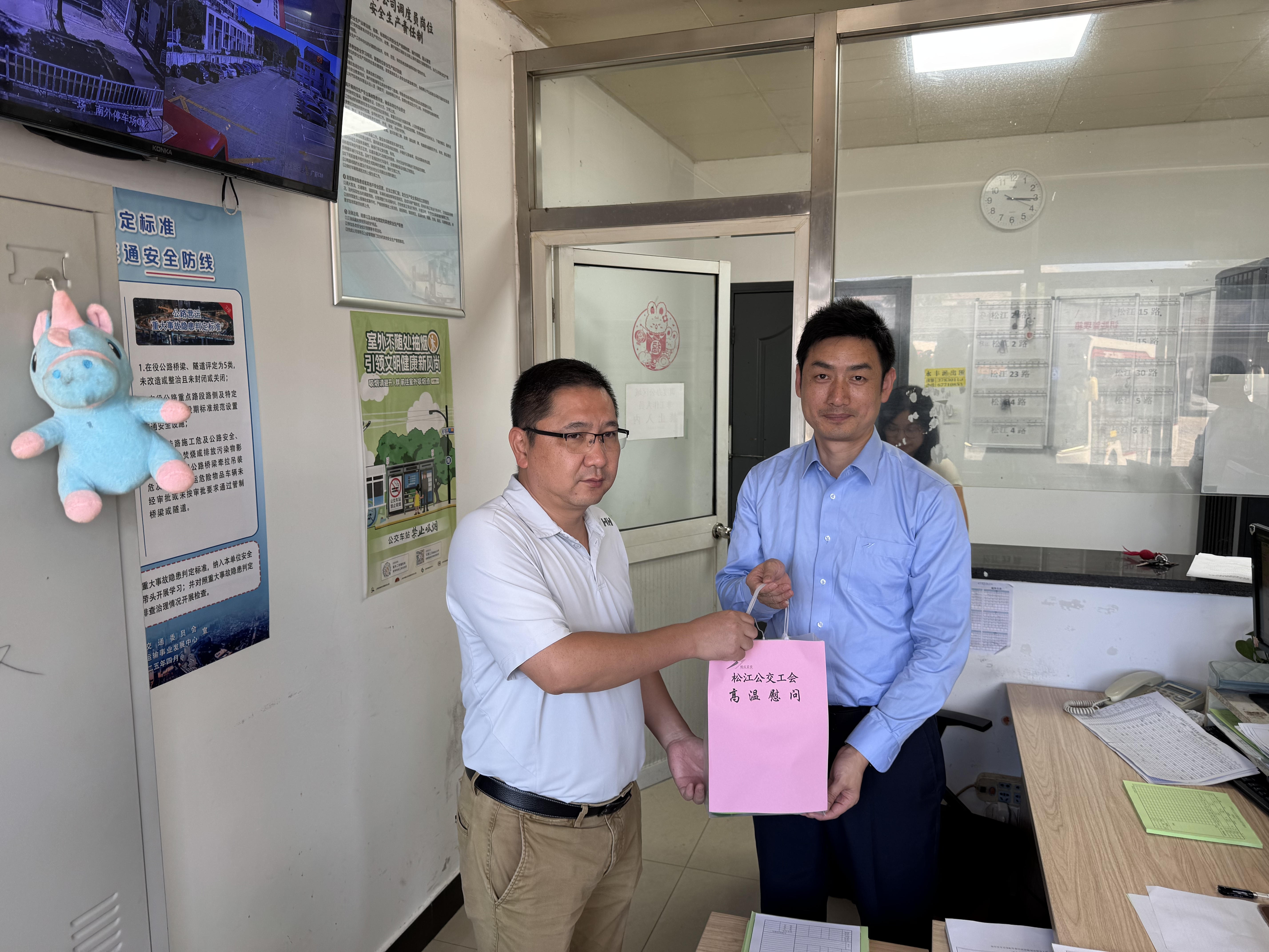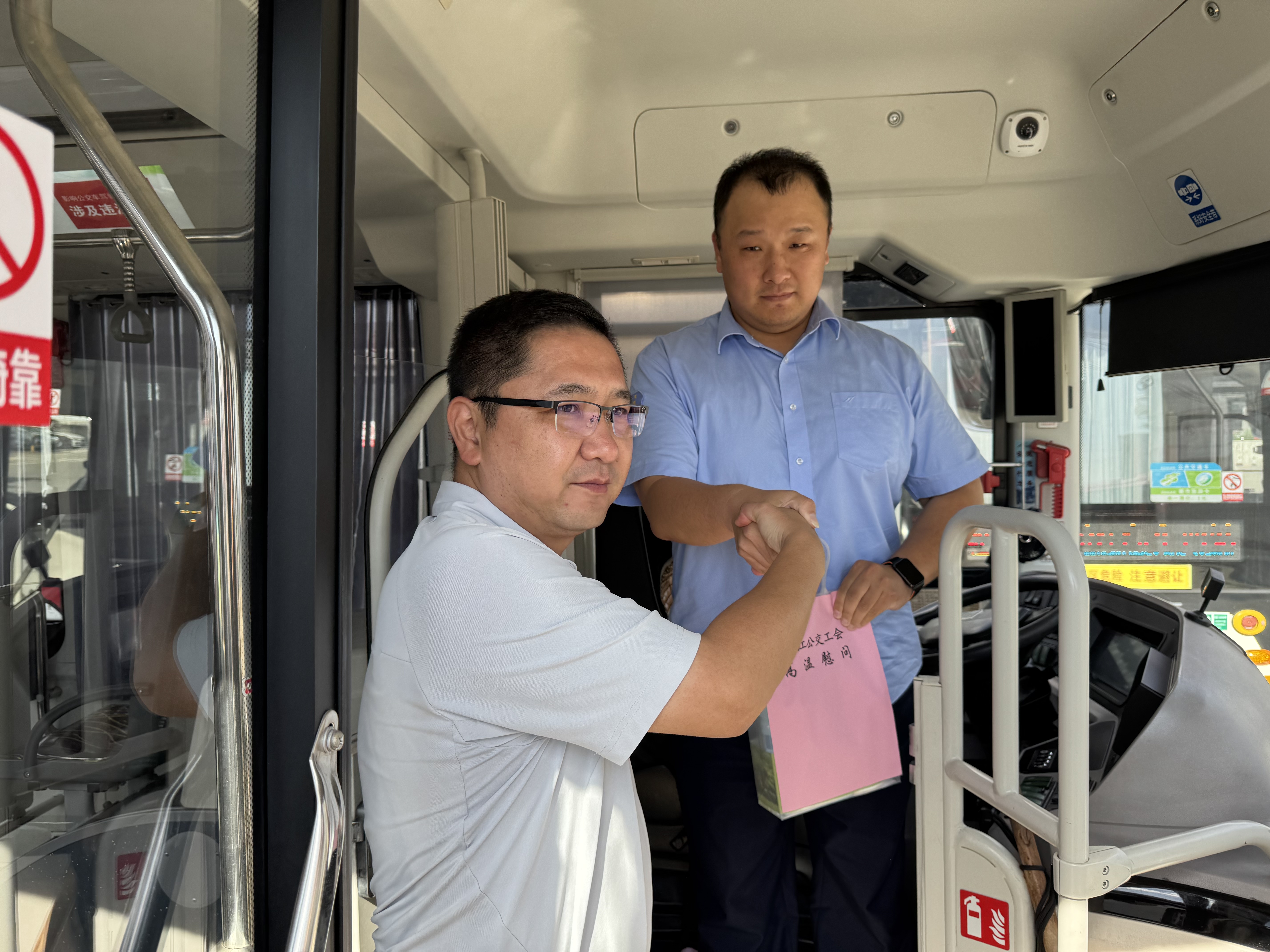 正当松江 5 路公交车下完乘客后,寿总亲自提着慰问品走向驾驶员。他脸上带着亲切的笑容,眼神中满是关切,将慰问品交到驾驶员手中,并与驾驶员亲切交谈。寿总详细询问了驾驶员在高温天气下的工作情况和身体状况,叮嘱他们一定要注意防暑降温,合理安排工作和休息时间,确保自身的身体健康。驾驶员接过慰问品,感激之情溢于言表,他表示,虽然天气炎热,但公司的关怀让他们心里倍感温暖,他们会继续坚守岗位,保障市民的出行安全。